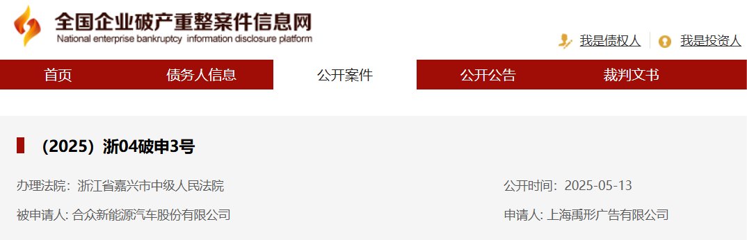 记者得悉,5月13日,全国企业破产重整案子信息网揭露显现,哪吒轿车相关公司合众新能源轿车股份有限公司(以下简称合众新能源)新增一条破产检查案子,请求人为上海禹形广告有限公司,经办法院为浙江省嘉兴市中级人民法院。